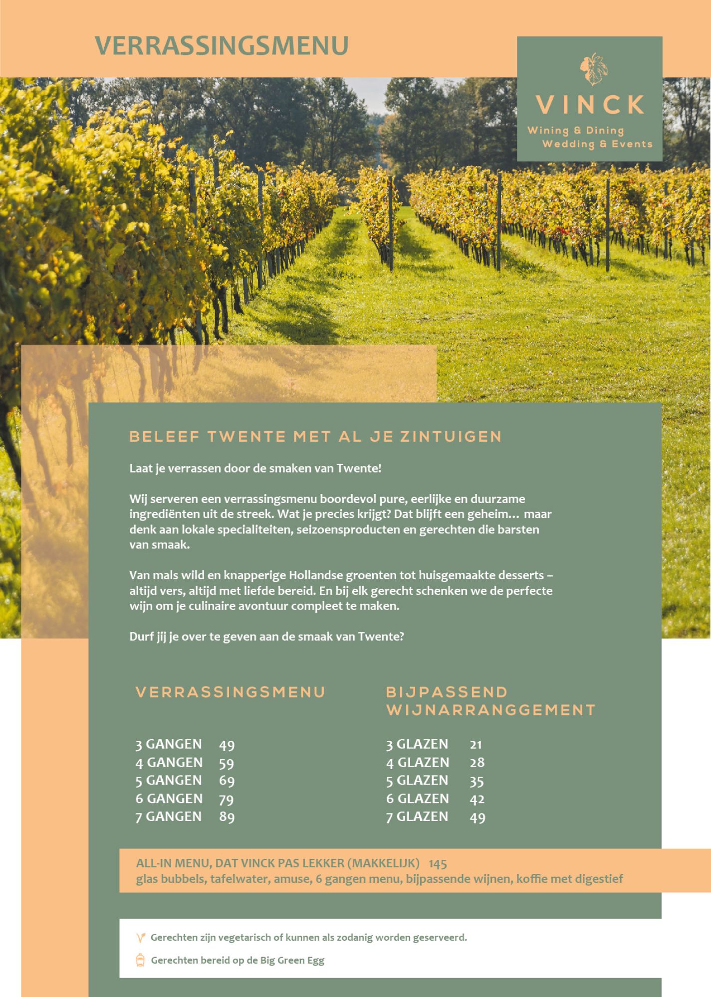 Van lokaal wild, Hollandse groenten tot huisgemaakte desserts. Duik in onze dinerkaart en zie wat voor een (h)eerlijks Twente ons brengt! Stap binnen in de culinaire wereld van top chef Rob Kleinsman en ervaar een waar culinair feest op de tong.
